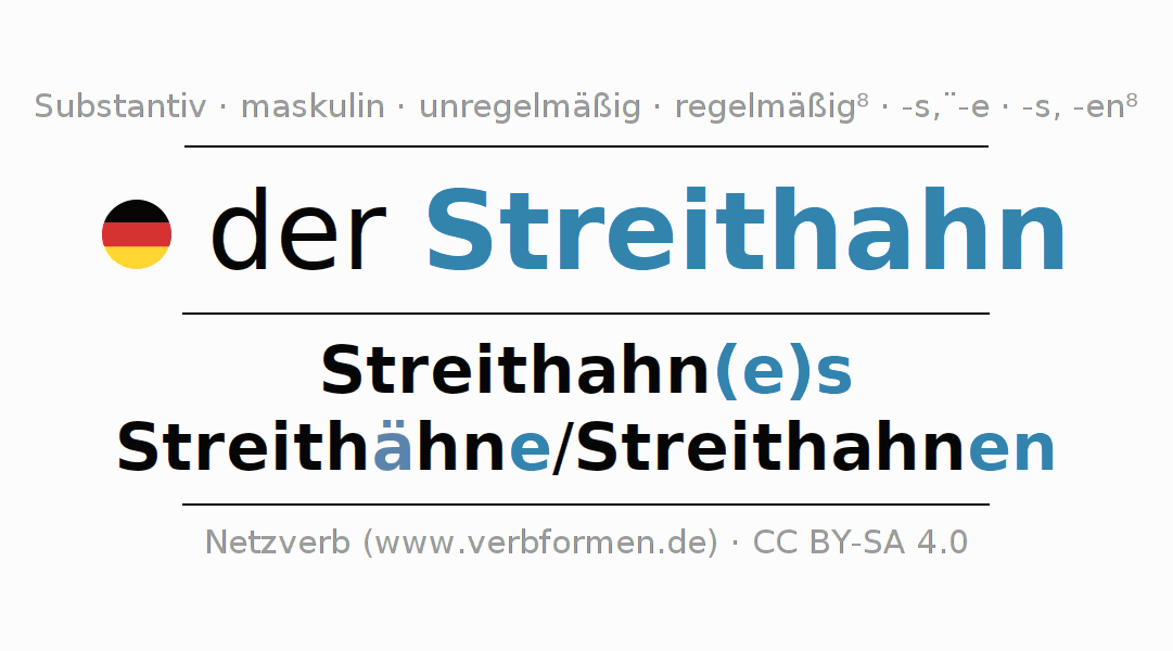 Nom. | der Streithahn | die Streithähne/Streithahnen |