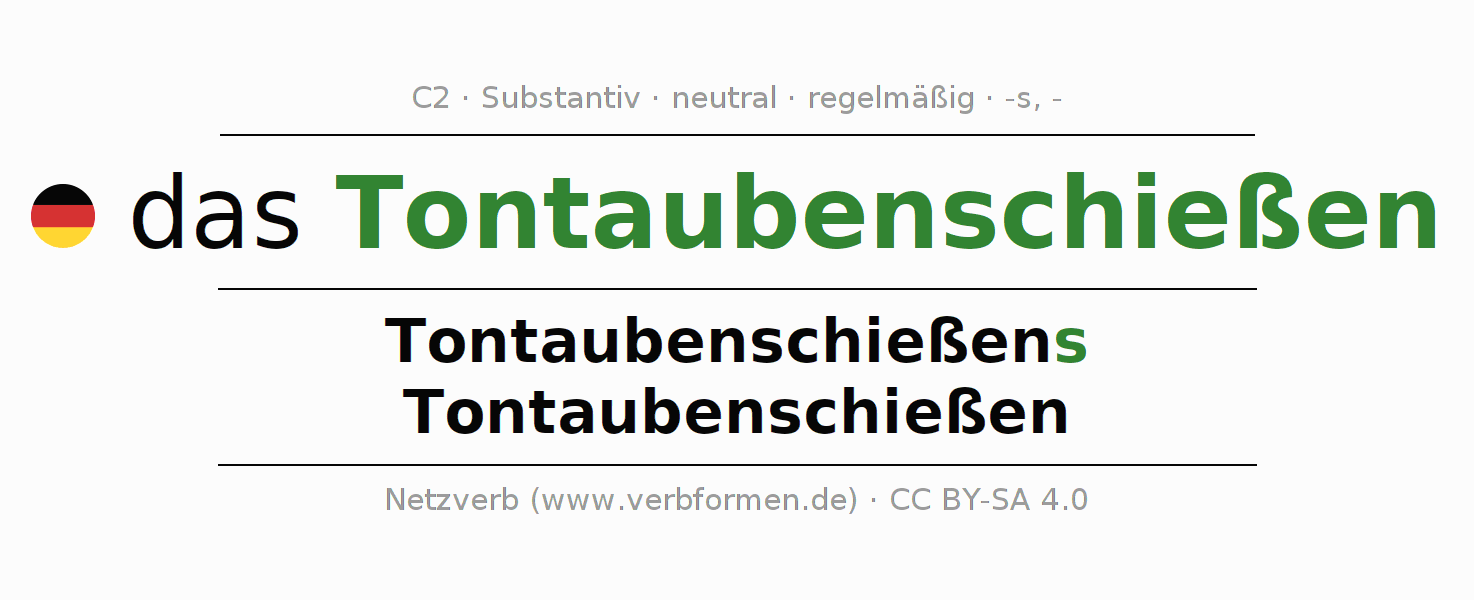 - Plural: die Tontaubenschießen, der Tontaubenschießen, den Tontaubenschießen, die Tontaubenschießen