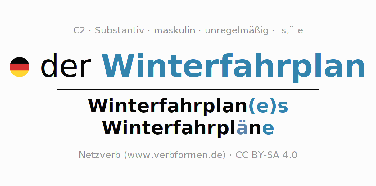 - Plural: die Winterfahrpläne, der Winterfahrpläne, den Winterfahrplänen, die Winterfahrpläne