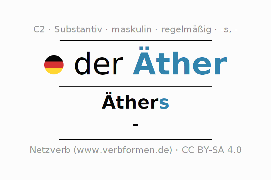 Die Deklination des Substantivs Äther ist im Singular Genitiv Äthers und im Plural Nominativ -. Das Nomen Äther wird stark mit den Deklinationsendungen s/- dekliniert. Es bildet keine Pluralformen. Das Genus bzw. grammatische Geschlecht von Äther ist Maskulin und der bestimmte Artikel ist "der". Man kann hier nicht nur Äther deklinieren, sondern alle deutschen Substantive. Das Substantiv gehört zum Wortschatz des Zertifikats Deutsch bzw. zur Stufe C2. Kommentare ☆