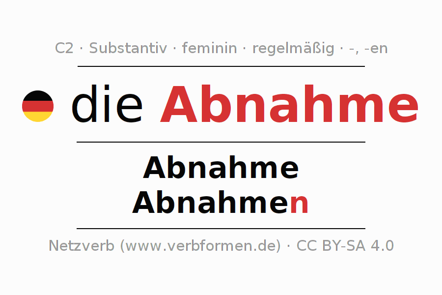 - Plural: die Abnahmen, der Abnahmen, den Abnahmen, die Abnahmen