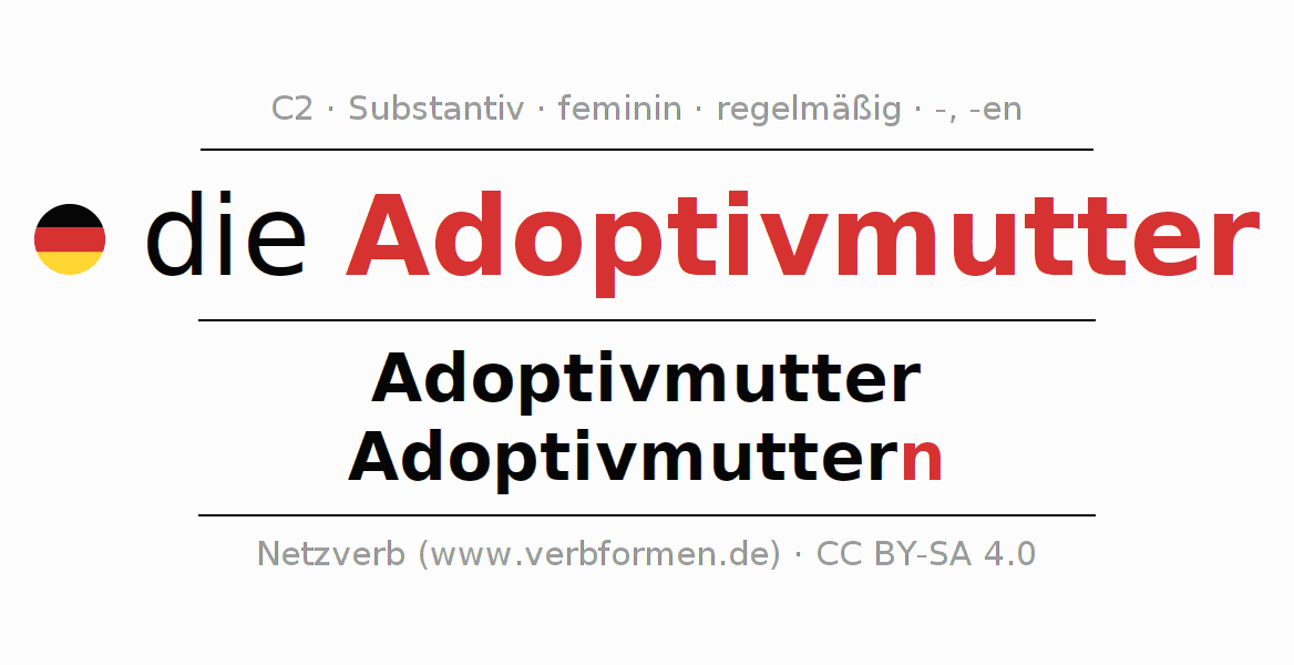 - Singular: die Adoptivmutter, der Adoptivmutter, der Adoptivmutter, die Adoptivmutter
