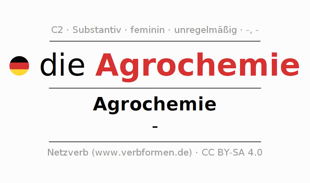Die Deklination des Substantivs Agrochemie ist im Singular Genitiv Agrochemie und im Plural Nominativ -. Das Nomen Agrochemie wird mit den Deklinationsendungen -/- dekliniert. Es bildet keine Pluralformen. Das Genus bzw. grammatische Geschlecht von Agrochemie ist Feminin und der bestimmte Artikel ist "die". Man kann hier nicht nur Agrochemie deklinieren, sondern alle deutschen Substantive. Das Substantiv gehört zum Wortschatz des Zertifikats Deutsch bzw. zur Stufe C2. Kommentare ☆
