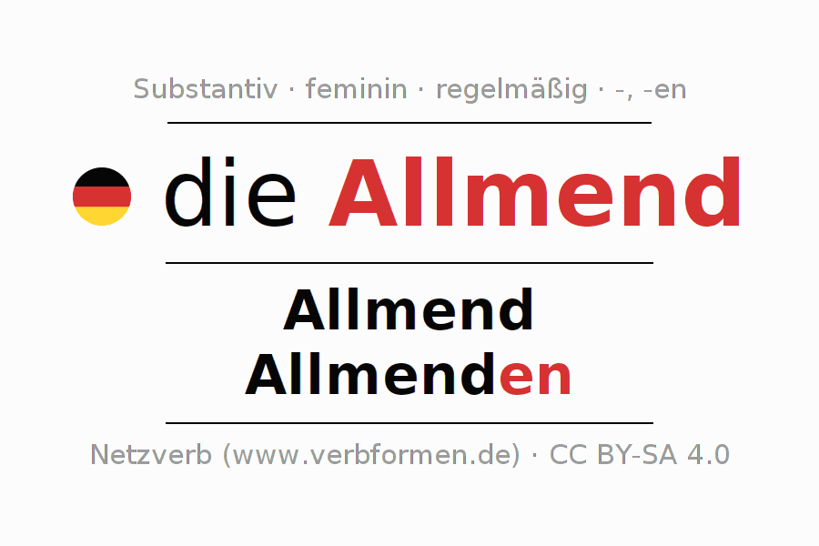 - Plural: die Allmenden, der Allmenden, den Allmenden, die Allmenden