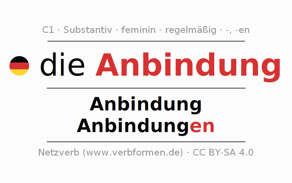 - Singular: die Anbindung, der Anbindung, der Anbindung, die Anbindung