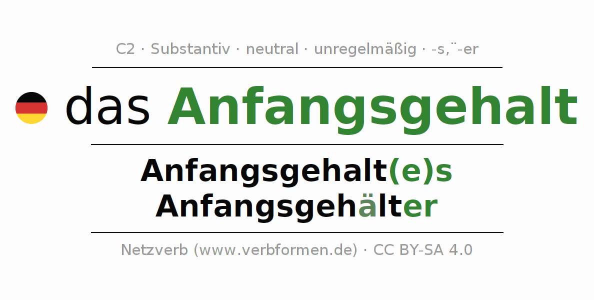 - Singular: das Anfangsgehalt, des Anfangsgehalt(e)s, dem Anfangsgehalt(e), das Anfangsgehalt