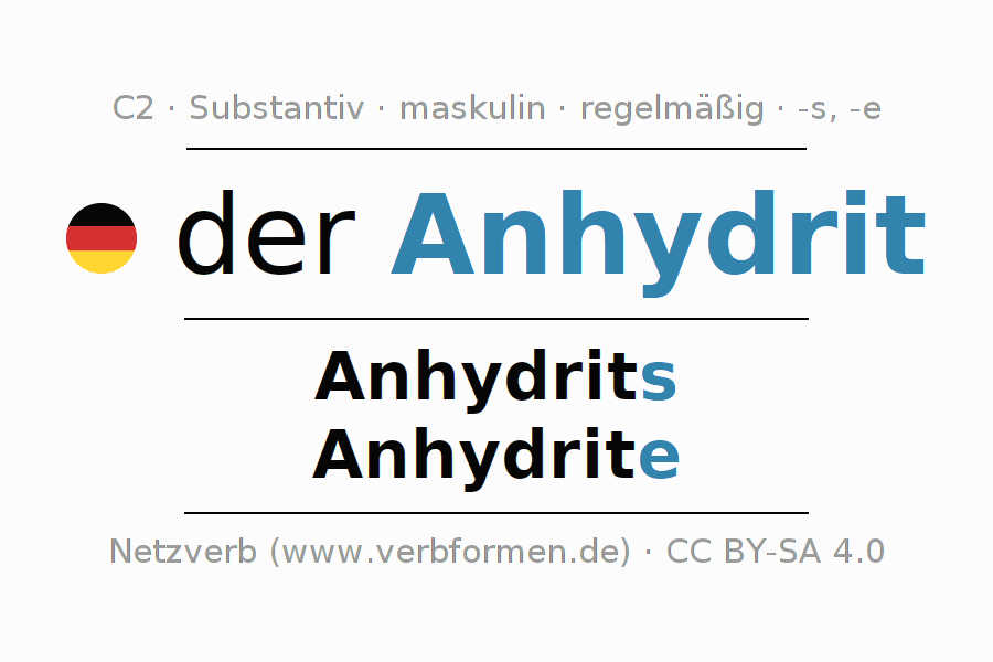 - Singular: der Anhydrit, des Anhydrits, dem Anhydrit, den Anhydrit