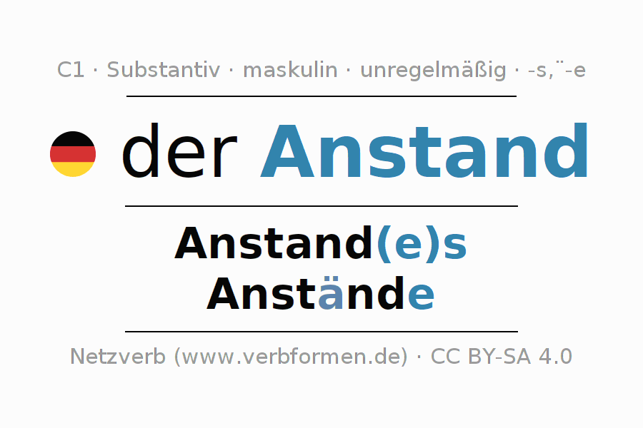 - Singular: der Anstand, des Anstand(e)s, dem Anstand(e), den Anstand