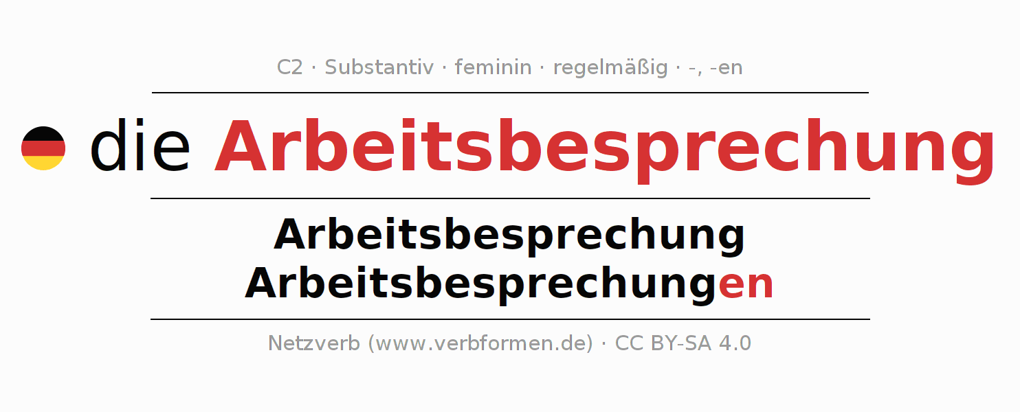 - Singular: die Arbeitsbesprechung, der Arbeitsbesprechung, der Arbeitsbesprechung, die Arbeitsbesprechung
