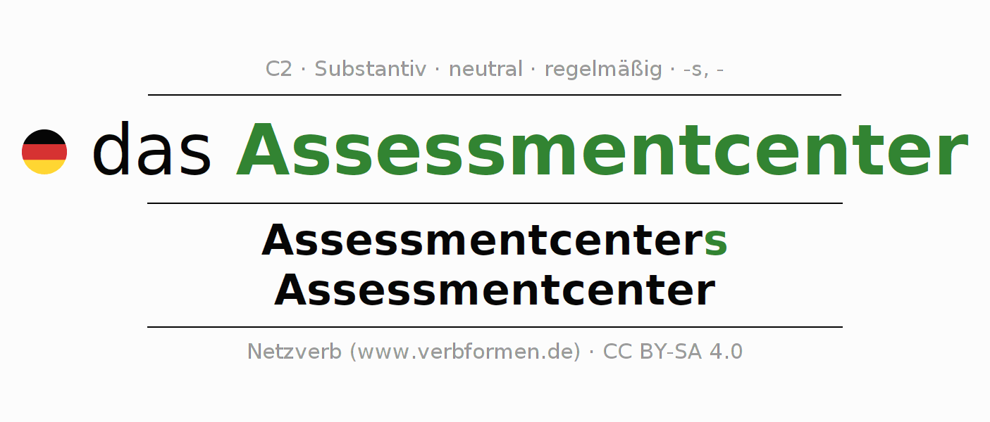- Plural: die Assessmentcenter, der Assessmentcenter, den Assessmentcentern, die Assessmentcenter