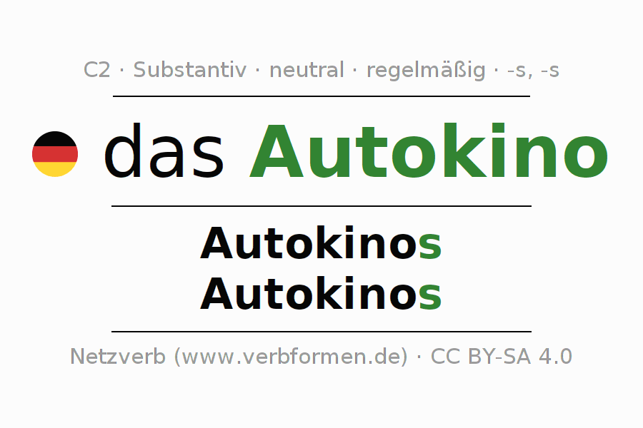 - Plural: die Autokinos, der Autokinos, den Autokinos, die Autokinos