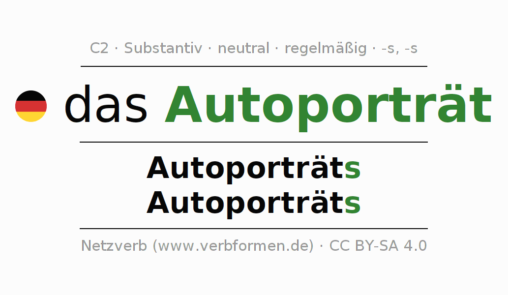 - Singular: das Autoporträt, des Autoporträts, dem Autoporträt, das Autoporträt