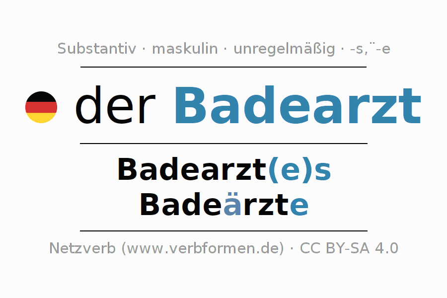 - Singular: der Badearzt, des Badearzt(e)s, dem Badearzt(e), den Badearzt