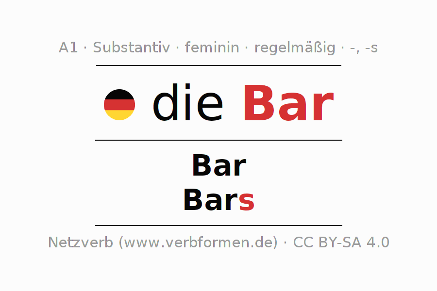 - Plural: die Bars, der Bars, den Bars, die Bars
