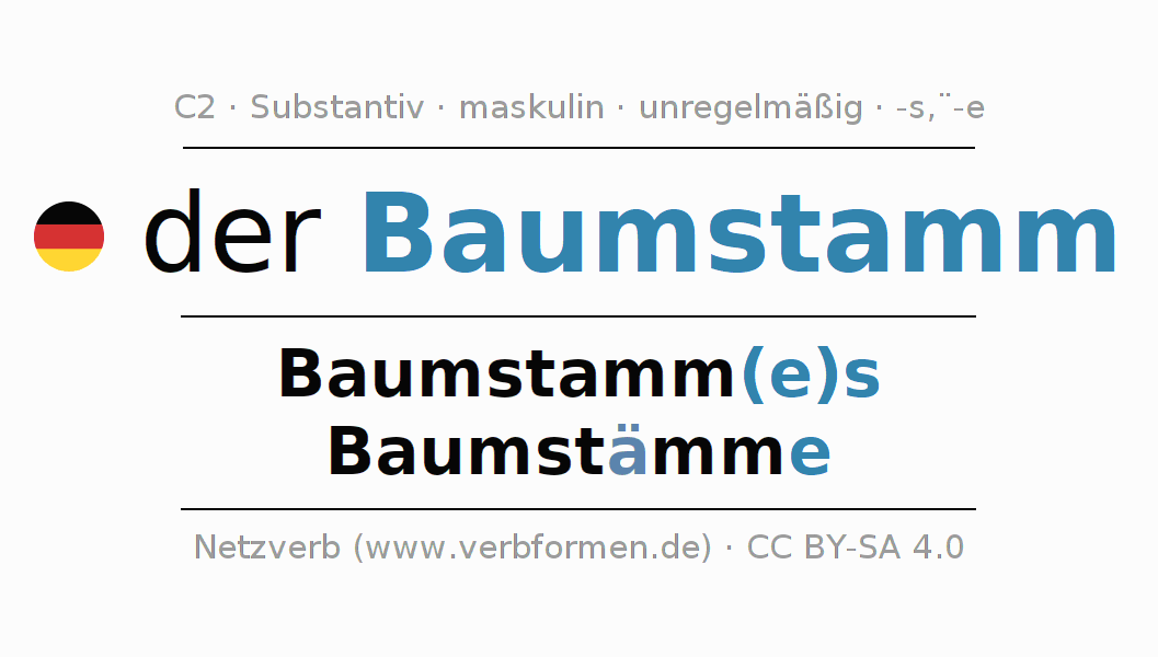 - Plural: die Baumstämme, der Baumstämme, den Baumstämmen, die Baumstämme