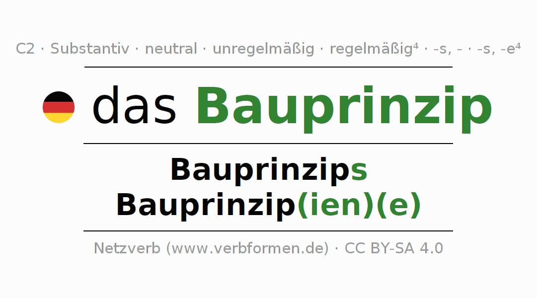 - Singular: das Bauprinzip, des Bauprinzips, dem Bauprinzip, das Bauprinzip