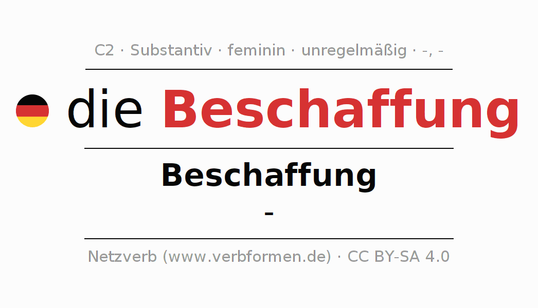 Die Deklination des Substantivs Beschaffung ist im Singular Genitiv Beschaffung und im Plural Nominativ -. Das Nomen Beschaffung wird mit den Deklinationsendungen -/- dekliniert. Es bildet keine Pluralformen. Das Genus bzw. grammatische Geschlecht von Beschaffung ist Feminin und der bestimmte Artikel ist "die". Man kann hier nicht nur Beschaffung deklinieren, sondern alle deutschen Substantive. Das Substantiv gehört zum Wortschatz des Zertifikats Deutsch bzw. zur Stufe C2. Kommentare ☆