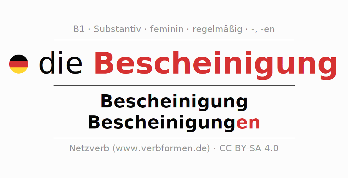 - Plural: die Bescheinigungen, der Bescheinigungen, den Bescheinigungen, die Bescheinigungen