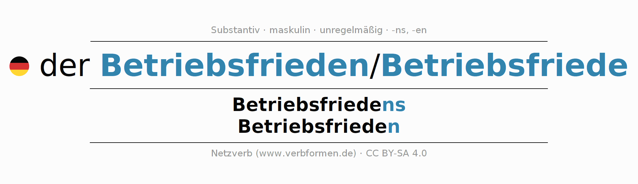 - Singular: der Betriebsfriede(n), des Betriebsfriedens, dem Betriebsfrieden, den Betriebsfrieden