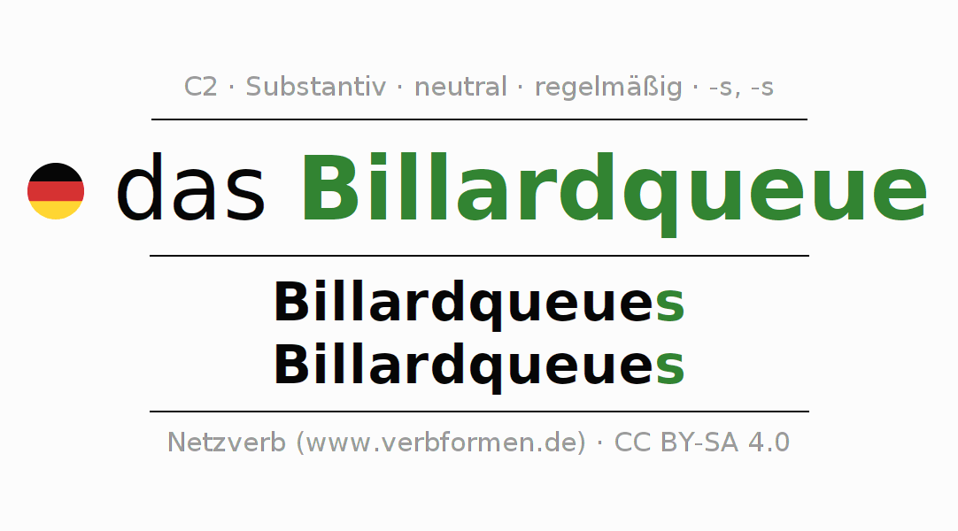 - Singular: das Billardqueue, des Billardqueues, dem Billardqueue, das Billardqueue