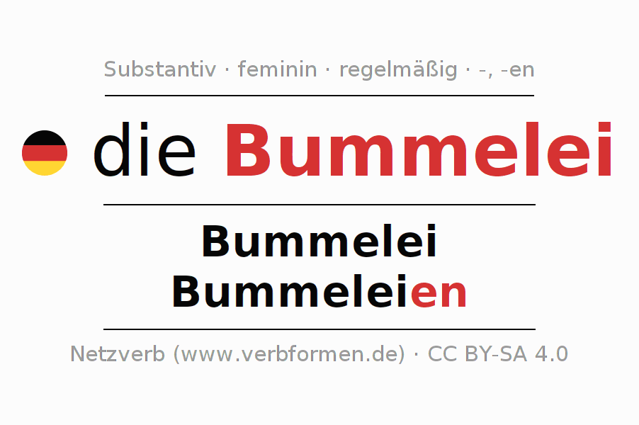 Die Deklination des Substantivs Bummelei ist im Singular Genitiv Bummelei und im Plural Nominativ Bummeleien. Das Nomen Bummelei wird schwach mit den Deklinationsendungen -/en dekliniert. Das Genus bzw. grammatische Geschlecht von Bummelei ist Feminin und der bestimmte Artikel ist "die". Man kann hier nicht nur Bummelei deklinieren, sondern alle deutschen Substantive. Kommentare ☆