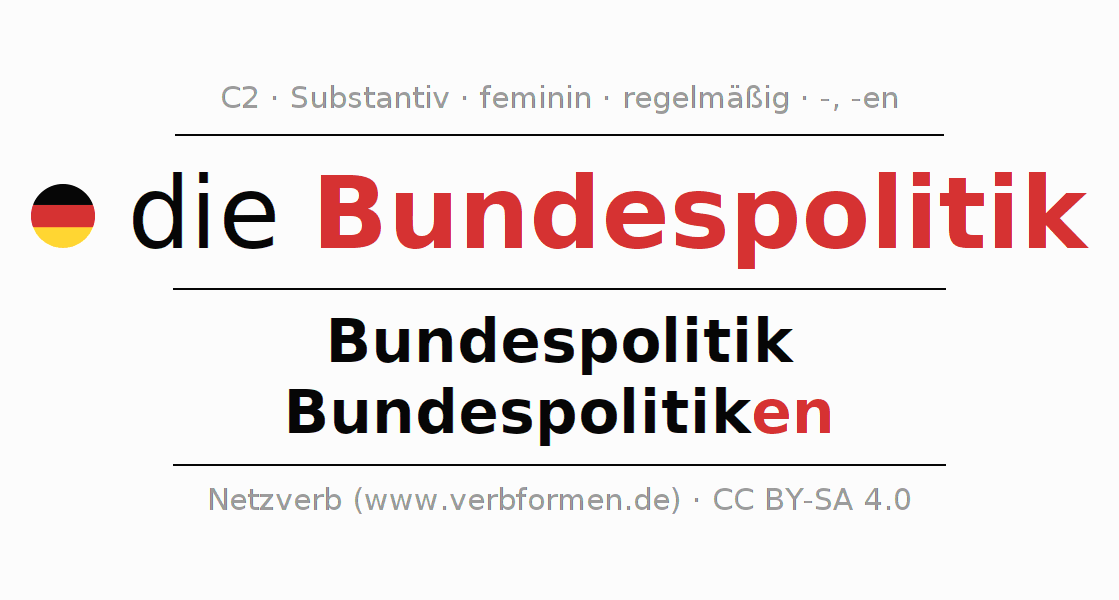 - Singular: die Bundespolitik, der Bundespolitik, der Bundespolitik, die Bundespolitik
