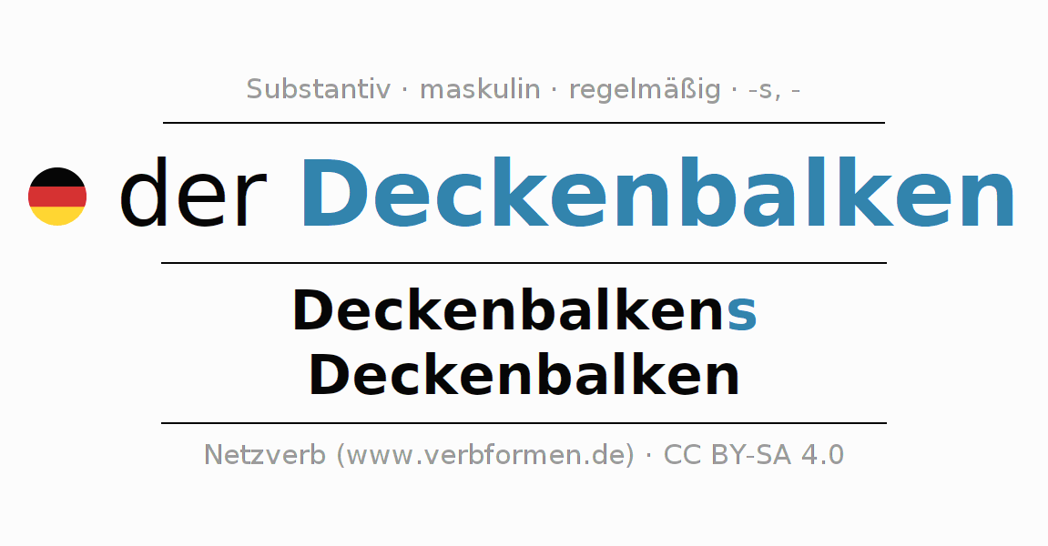 - Singular: der Deckenbalken, des Deckenbalkens, dem Deckenbalken, den Deckenbalken