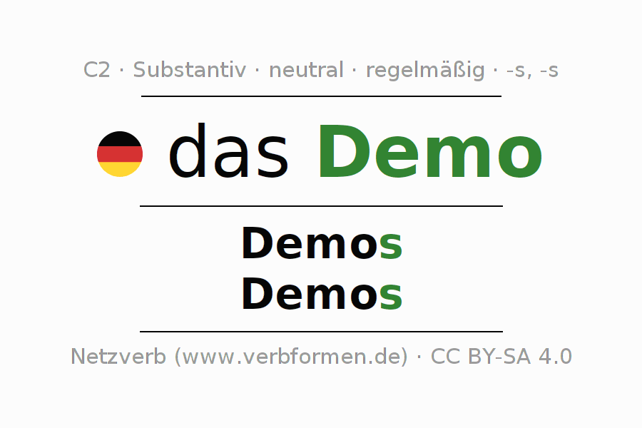 - Plural: die Demos, der Demos, den Demos, die Demos