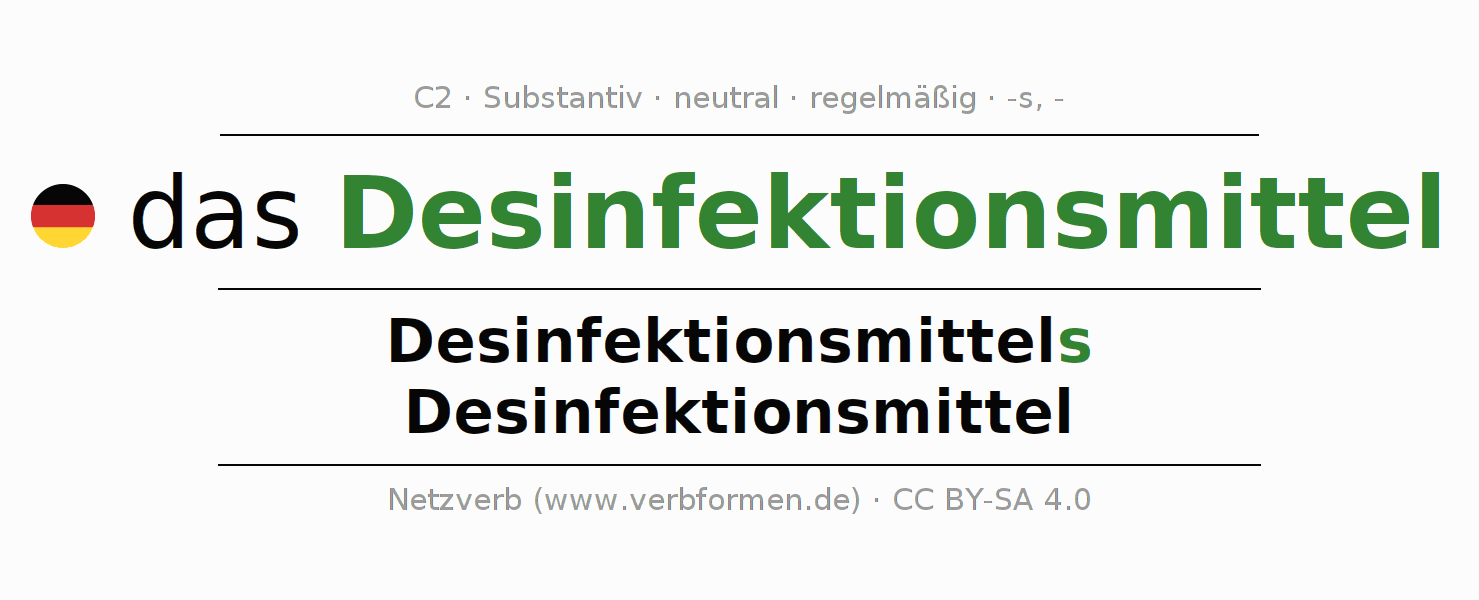 - Singular: das Desinfektionsmittel, des Desinfektionsmittels, dem Desinfektionsmittel, das Desinfektionsmittel