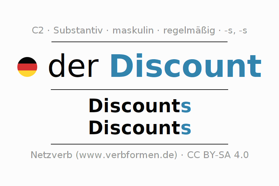 - Plural: die Discounts, der Discounts, den Discounts, die Discounts