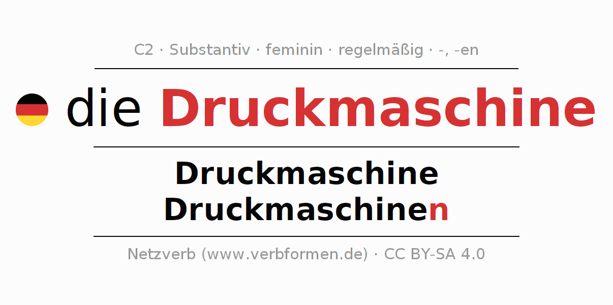 - Plural: die Druckmaschinen, der Druckmaschinen, den Druckmaschinen, die Druckmaschinen