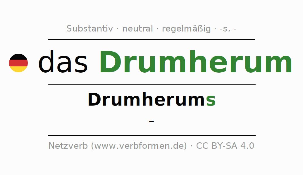 Die Deklination des Substantivs Drumherum ist im Singular Genitiv Drumherums und im Plural Nominativ -. Das Nomen Drumherum wird stark mit den Deklinationsendungen s/- dekliniert. Es bildet keine Pluralformen. Das Genus bzw. grammatische Geschlecht von Drumherum ist Neutral und der bestimmte Artikel ist "das". Man kann hier nicht nur Drumherum deklinieren, sondern alle deutschen Substantive. Kommentare ☆