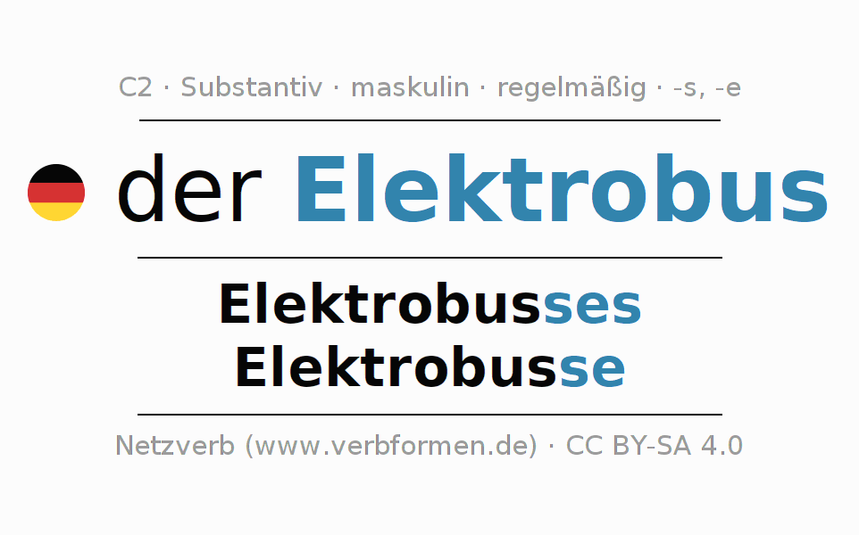 - Plural: die Elektrobusse, der Elektrobusse, den Elektrobussen, die Elektrobusse