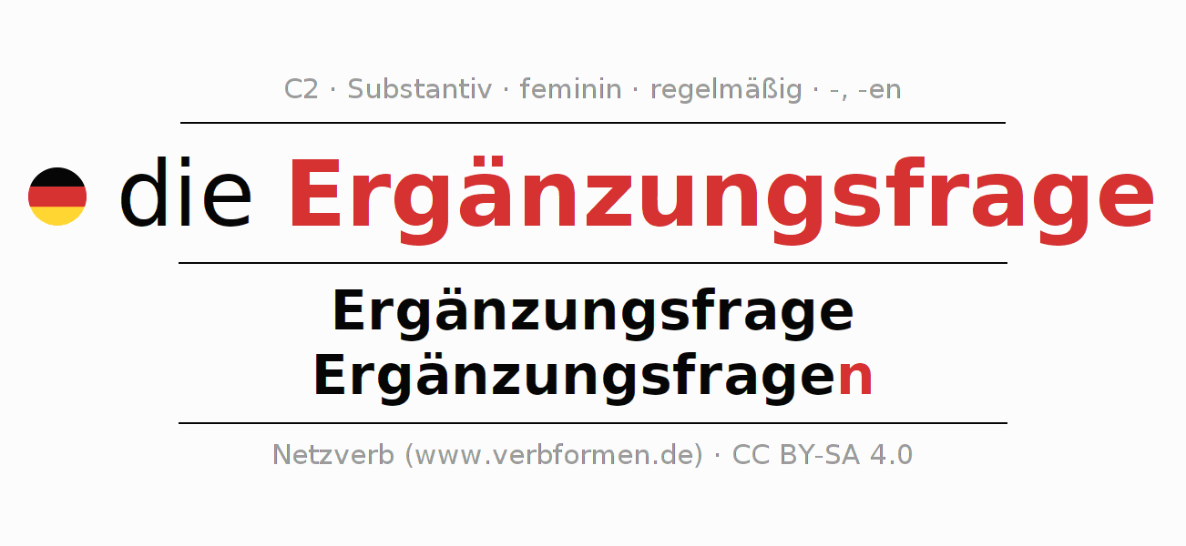 - Plural: die Ergänzungsfragen, der Ergänzungsfragen, den Ergänzungsfragen, die Ergänzungsfragen