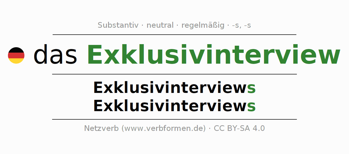 - Singular: das Exklusivinterview, des Exklusivinterviews, dem Exklusivinterview, das Exklusivinterview