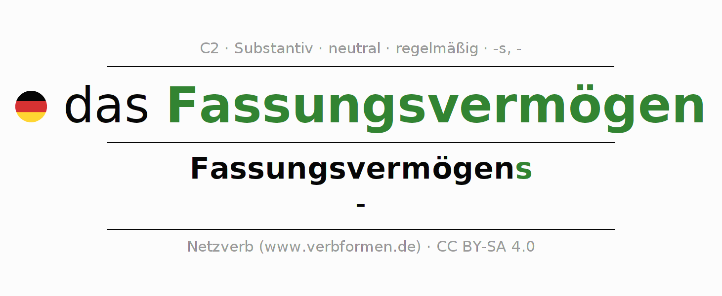 - Singular: das Fassungsvermögen, des Fassungsvermögens, dem Fassungsvermögen, das Fassungsvermögen