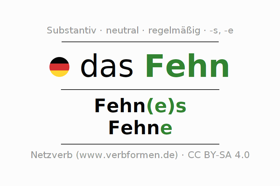 Die Deklination des Substantivs Fehn ist im Singular Genitiv Fehn(e)s und im Plural Nominativ Fehne. Das Nomen Fehn wird stark mit den Deklinationsendungen es/e dekliniert. Das Genus bzw. grammatische Geschlecht von Fehn ist Neutral und der bestimmte Artikel ist "das". Man kann hier nicht nur Fehn deklinieren, sondern alle deutschen Substantive. Kommentare ☆