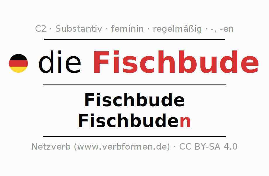 - Singular: die Fischbude, der Fischbude, der Fischbude, die Fischbude