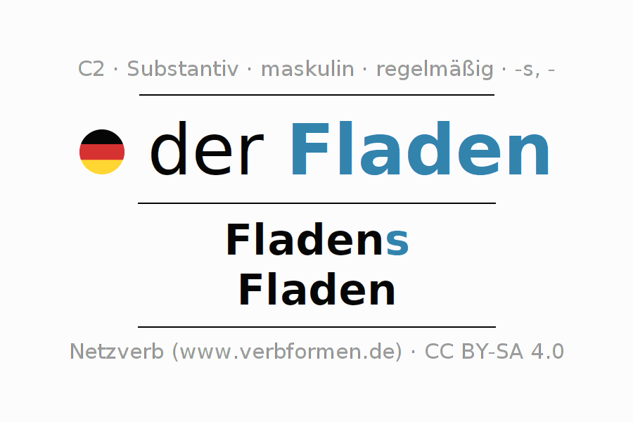 Die Deklination des Substantivs Fladen ist im Singular Genitiv Fladens und im Plural Nominativ Fladen. Das Nomen Fladen wird stark mit den Deklinationsendungen s/- dekliniert. Das Genus bzw. grammatische Geschlecht von Fladen ist Maskulin und der bestimmte Artikel ist "der". Man kann hier nicht nur Fladen deklinieren, sondern alle deutschen Substantive. Das Substantiv gehört zum Wortschatz des Zertifikats Deutsch bzw. zur Stufe C2. Kommentare ☆
