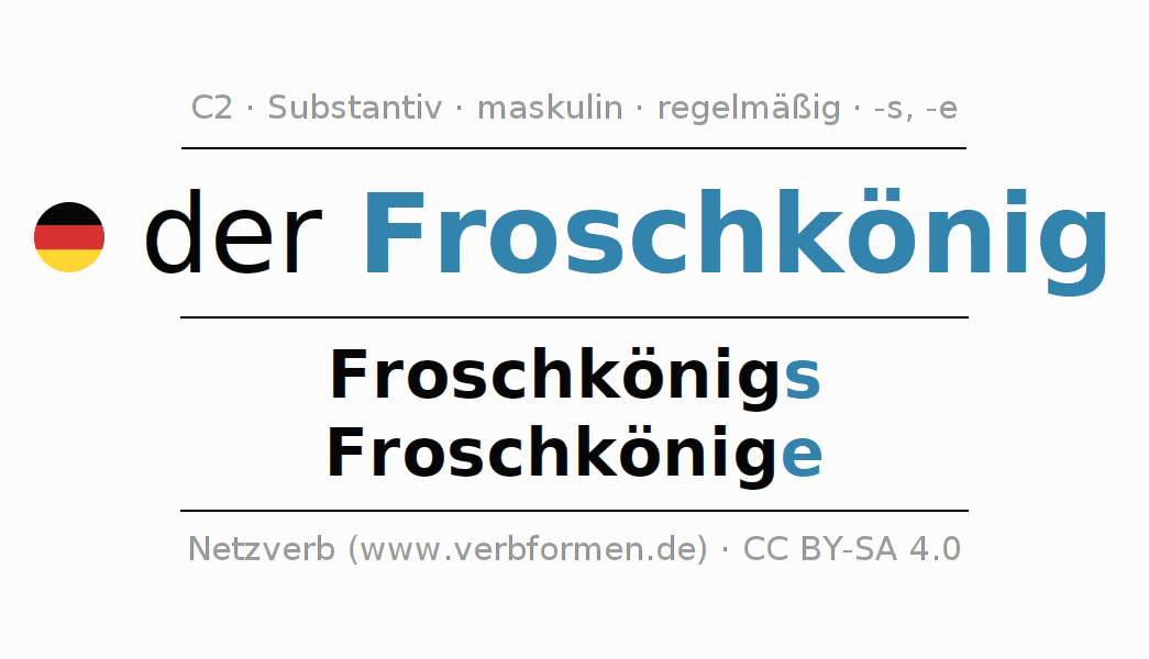 - Singular: der Froschkönig, des Froschkönigs, dem Froschkönig, den Froschkönig
