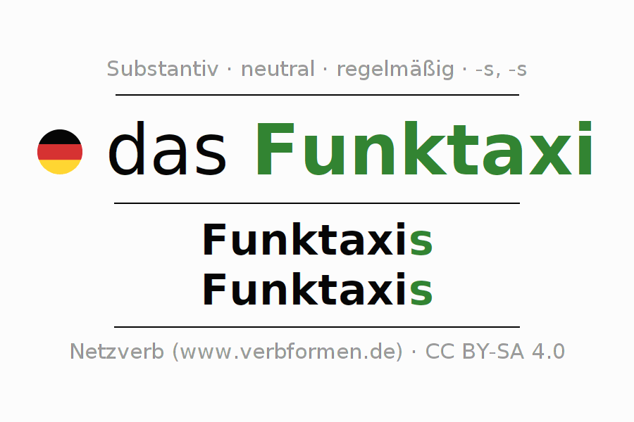 - Singular: das Funktaxi, des Funktaxis, dem Funktaxi, das Funktaxi