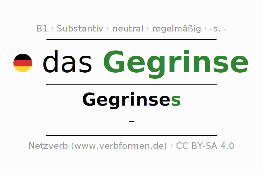 Die Deklination des Substantivs Gegrinse ist im Singular Genitiv Gegrinses und im Plural Nominativ -. Das Nomen Gegrinse wird stark mit den Deklinationsendungen s/- dekliniert. Es bildet keine Pluralformen. Das Genus bzw. grammatische Geschlecht von Gegrinse ist Neutral und der bestimmte Artikel ist "das". Man kann hier nicht nur Gegrinse deklinieren, sondern alle deutschen Substantive. Das Substantiv gehört zum Wortschatz des Zertifikats Deutsch bzw. zur Stufe B1. Kommentare ☆