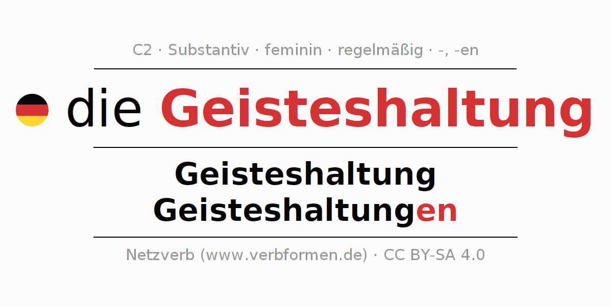| Nom. | die Geisteshaltung | die Geisteshaltungen |