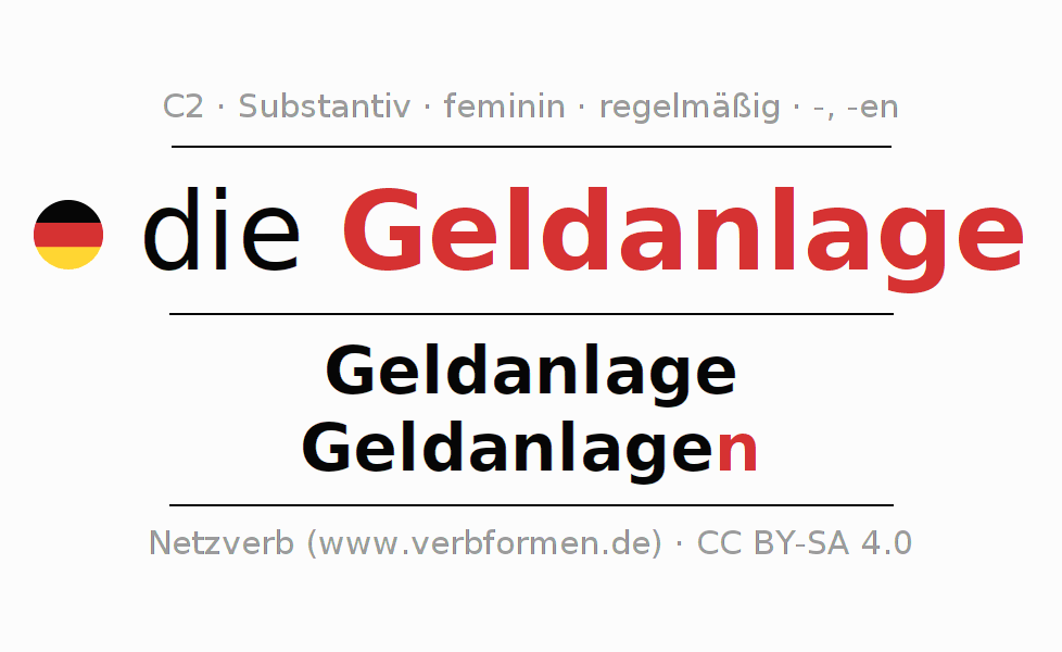 - Plural: die Geldanlagen, der Geldanlagen, den Geldanlagen, die Geldanlagen