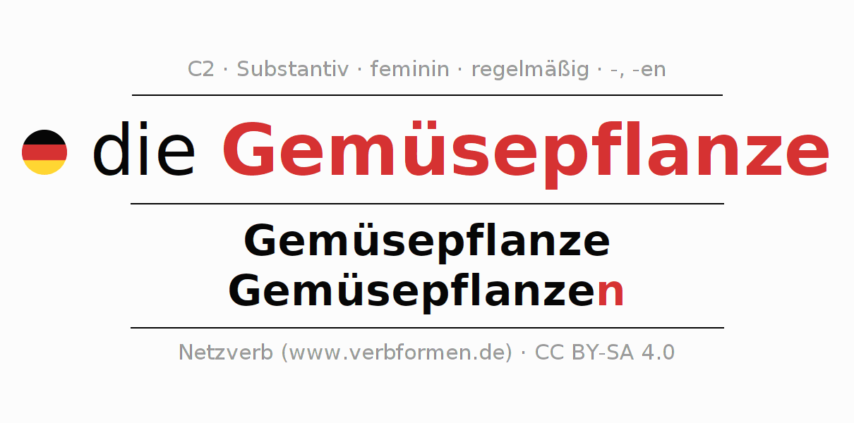 - Singular: die Gemüsepflanze, der Gemüsepflanze, der Gemüsepflanze, die Gemüsepflanze