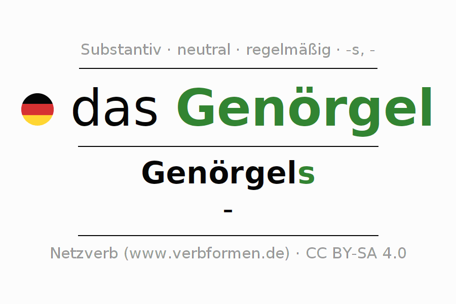 Die Deklination des Substantivs Genörgel ist im Singular Genitiv Genörgels und im Plural Nominativ -. Das Nomen Genörgel wird stark mit den Deklinationsendungen s/- dekliniert. Es bildet keine Pluralformen. Das Genus bzw. grammatische Geschlecht von Genörgel ist Neutral und der bestimmte Artikel ist "das". Man kann hier nicht nur Genörgel deklinieren, sondern alle deutschen Substantive. Kommentare ☆