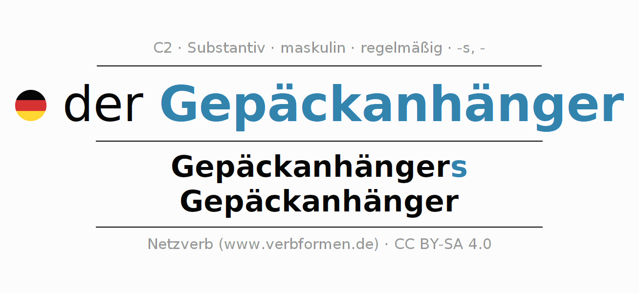 - Singular: der Gepäckanhänger, des Gepäckanhängers, dem Gepäckanhänger, den Gepäckanhänger