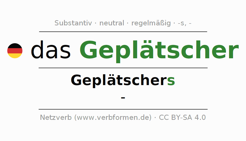 Die Deklination des Substantivs Geplätscher ist im Singular Genitiv Geplätschers und im Plural Nominativ -. Das Nomen Geplätscher wird stark mit den Deklinationsendungen s/- dekliniert. Es bildet keine Pluralformen. Das Genus bzw. grammatische Geschlecht von Geplätscher ist Neutral und der bestimmte Artikel ist "das". Man kann hier nicht nur Geplätscher deklinieren, sondern alle deutschen Substantive. Kommentare ☆