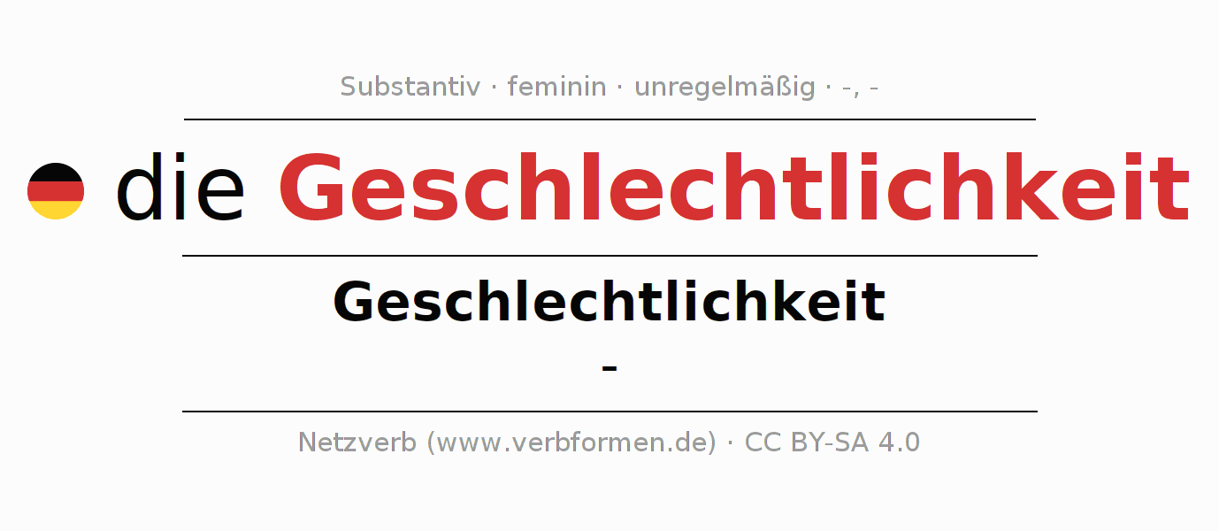 Die Deklination des Substantivs Geschlechtlichkeit ist im Singular Genitiv Geschlechtlichkeit und im Plural Nominativ -. Das Nomen Geschlechtlichkeit wird mit den Deklinationsendungen -/- dekliniert. Es bildet keine Pluralformen. Das Genus bzw. grammatische Geschlecht von Geschlechtlichkeit ist Feminin und der bestimmte Artikel ist "die". Man kann hier nicht nur Geschlechtlichkeit deklinieren, sondern alle deutschen Substantive. Kommentare ☆