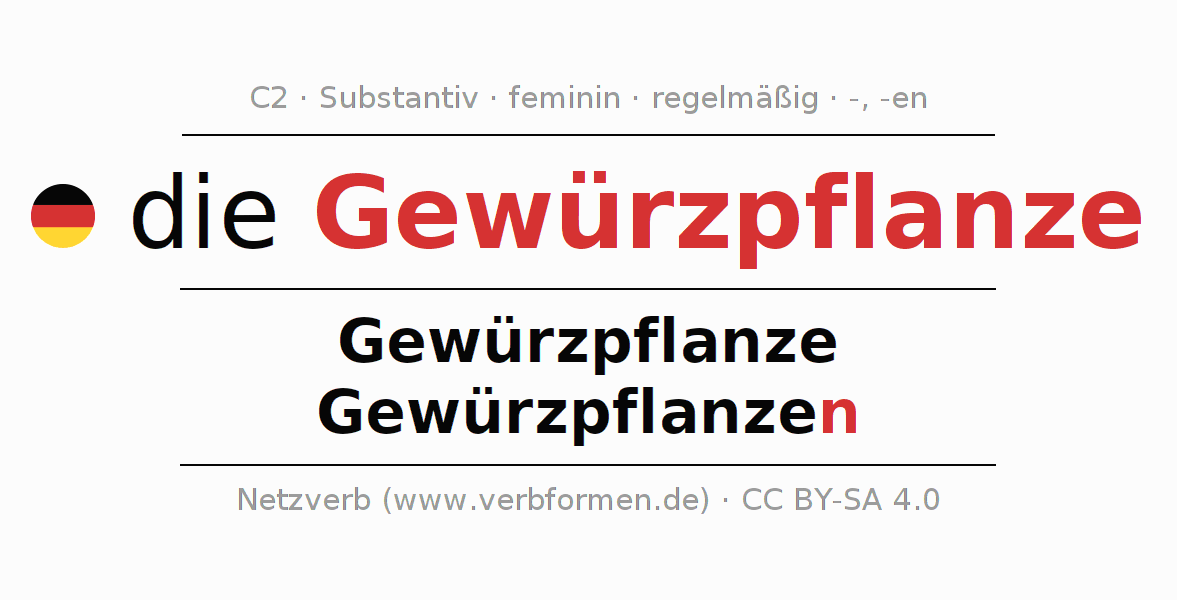 - Singular: die Gewürzpflanze, der Gewürzpflanze, der Gewürzpflanze, die Gewürzpflanze